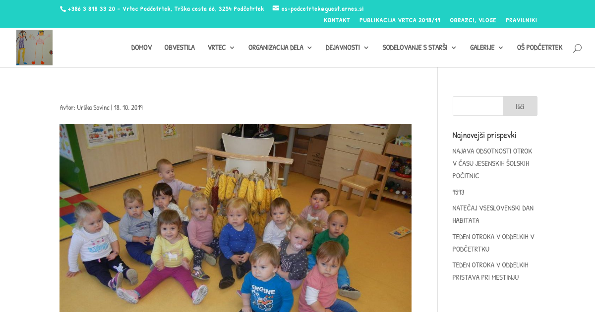 V četrtek, 17. oktobra 2019, smo v oddelek 7 povabili dedke in babice na star kmečki običaj – ličkanje koruze, ki je nekdaj veljalo za najpomembnejše jesensko opravilo. Otroci so že pred tem skupaj s starši prinašali jesenske pridelke in plodove, med tem tudi koruzo, katero smo lahko uporabili za naše družabno dopoldne. Otroci so se obiska svojih starih staršev zelo razveselili. Pred pričetkom dela smo za uvod skupaj zapeli pesmico, nato pa zavihali rokave in pričeli z našo dejavnost. Otroci so s pomočjo svojih starih staršev ličkali po svojih zmožnostih in zavezano koruzo nadeli na simbolični kozolec. Preživeli smo lepo in sproščeno družabno dopoldne.