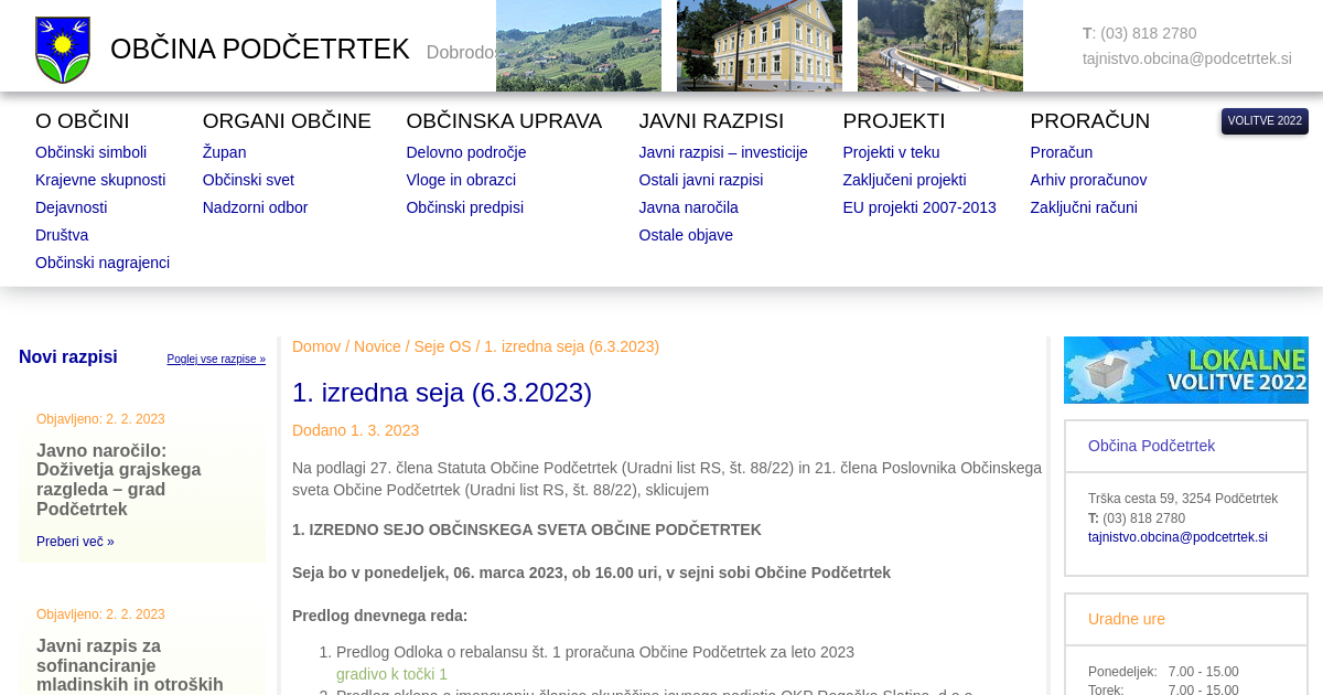 Na podlagi 27. člena Statuta Občine Podčetrtek (Uradni list RS, št. 88/22) in 21. člena Poslovnika Občinskega sveta Občine Podčetrtek (Uradni list RS, št. 88/22), sklicujem 1. IZREDNO SEJO OBČINSKEGA SVETA OBČINE PODČETRTEK Seja bo v ponedeljek, 06. marca 2023, ob 16.00 uri, v sejni sobi Občine Podčetrtek Predlog dnevnega reda: Predlog Odloka o rebalansu