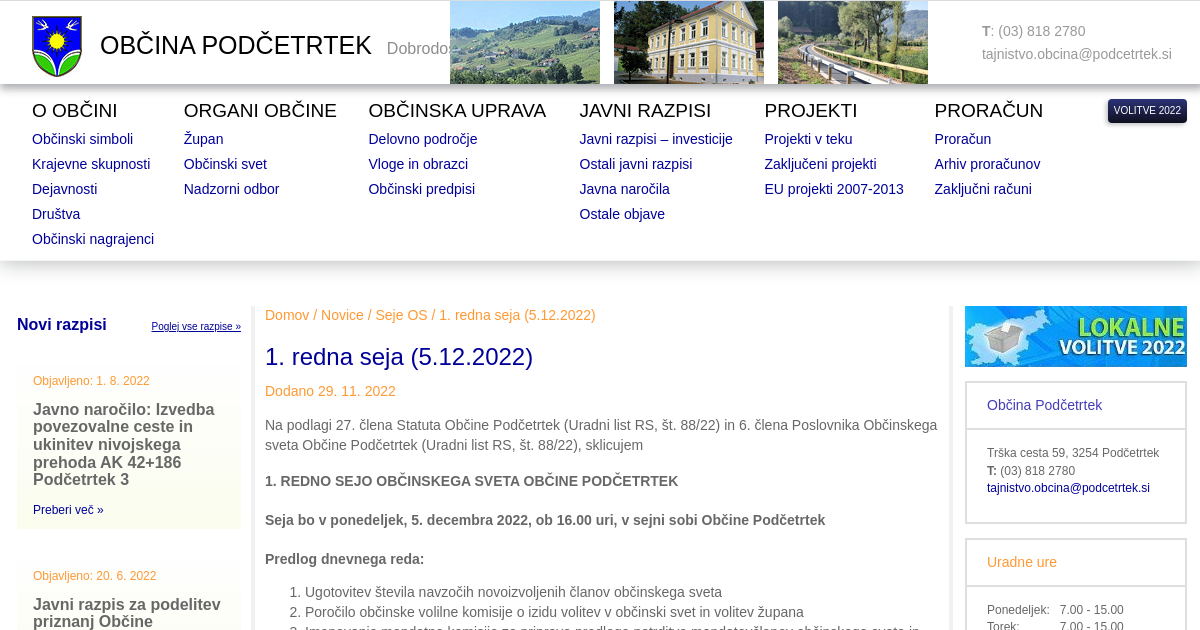 Na podlagi 27. člena Statuta Občine Podčetrtek (Uradni list RS, št. 88/22) in 6. člena Poslovnika Občinskega sveta Občine Podčetrtek (Uradni list RS, št. 88/22), sklicujem 1. REDNO SEJO OBČINSKEGA SVETA OBČINE PODČETRTEK Seja bo v ponedeljek, 5. decembra 2022, ob 16.00 uri, v sejni sobi Občine Podčetrtek Predlog dnevnega reda: Ugotovitev števila navzočih novoizvoljenih članov občinskega