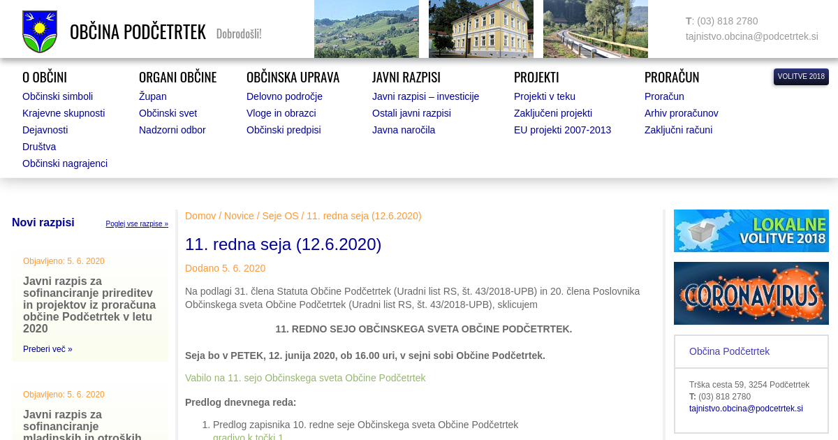 Na podlagi 31. člena Statuta Občine Podčetrtek (Uradni list RS, št. 43/2018-UPB) in 20. člena Poslovnika Občinskega sveta Občine Podčetrtek (Uradni list RS, št. 43/2018-UPB), sklicujem 11. REDNO SEJO OBČINSKEGA SVETA OBČINE PODČETRTEK. Seja bo v PETEK, 12. junija 2020, ob 16.00 uri, v sejni sobi Občine Podčetrtek. Vabilo na 11. sejo Občinskega sveta Občine