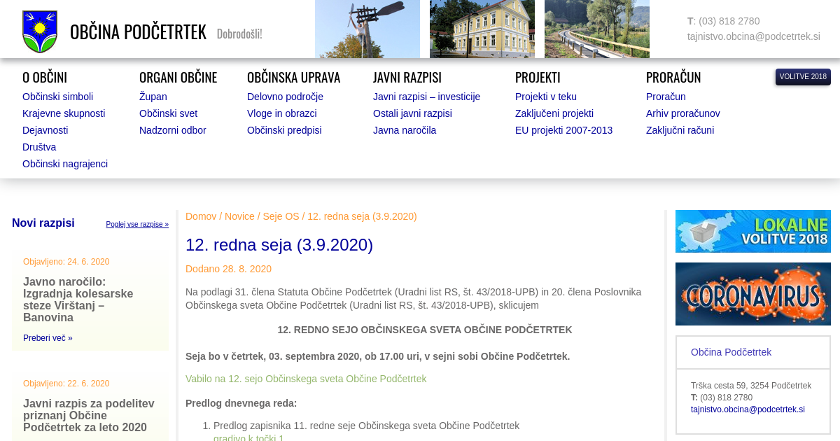 Na podlagi 31. člena Statuta Občine Podčetrtek (Uradni list RS, št. 43/2018-UPB) in 20. člena Poslovnika Občinskega sveta Občine Podčetrtek (Uradni list RS, št. 43/2018-UPB), sklicujem 12. REDNO SEJO OBČINSKEGA SVETA OBČINE PODČETRTEK Seja bo v četrtek, 03. septembra 2020, ob 17.00 uri, v sejni sobi Občine Podčetrtek. Vabilo na 12. sejo Občinskega sveta Občine
