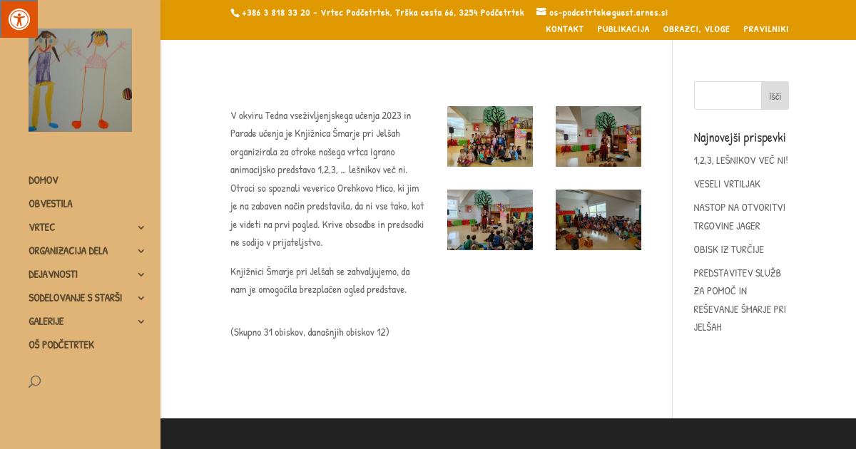 V okviru Tedna vseživljenjskega učenja 2023 in Parade učenja je Knjižnica Šmarje pri Jelšah organizirala za otroke našega vrtca igrano animacijsko predstavo 1,2,3, … lešnikov več ni. Otroci so spoznali veverico Orehkovo Mico, ki jim je na zabaven način predstavila, da ni vse tako, kot je videti na prvi pogled. Krive obsodbe in predsodki ne sodijo v prijateljstvo.