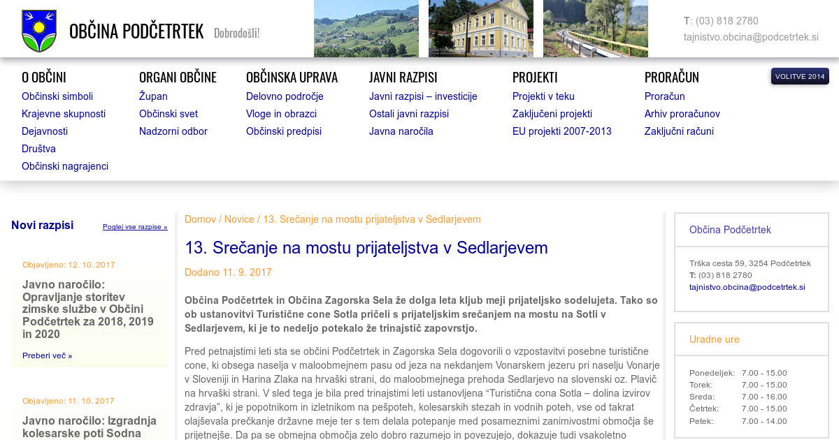 Občina Podčetrtek in Občina Zagorska Sela že dolga leta kljub meji prijateljsko sodelujeta. Tako so ob ustanovitvi Turistične cone Sotla pričeli s prijateljskim srečanjem na mostu na Sotli v Sedlarjevem, ki je to nedeljo potekalo že trinajstič zapovrstjo. Pred petnajstimi leti sta se občini Podčetrtek in Zagorska Sela dogovorili o vzpostavitvi posebne turistične cone, ki obsega