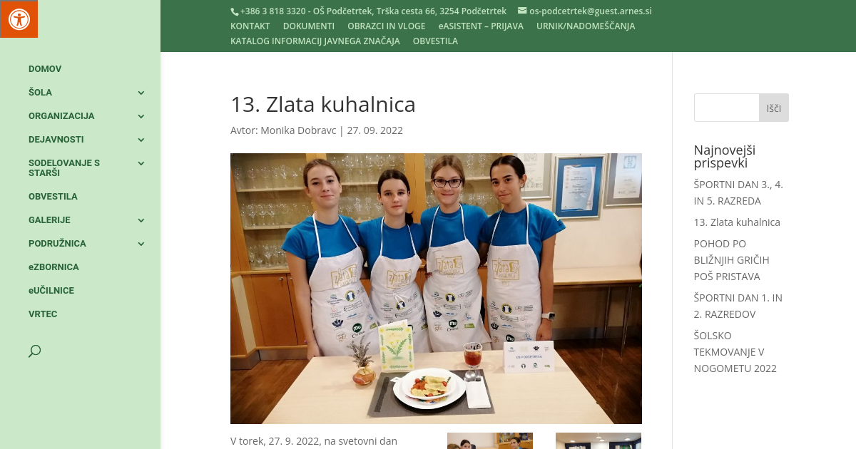 V torek, 27. 9. 2022, na svetovni dan turizma, smo se udeležile regijskega tekmovanja za 13. Zlato kuhalnico, ki je potekalo na Srednji šoli za gostinstvo in turizem v Celju. Letošnji izbrani jedi sta bili ravioli z mesnim nadevom in dodatkom užitnih divjih rastlin in zelišč z omako ter brezalkoholni hladni napitek na osnovi šipkovega čaja.