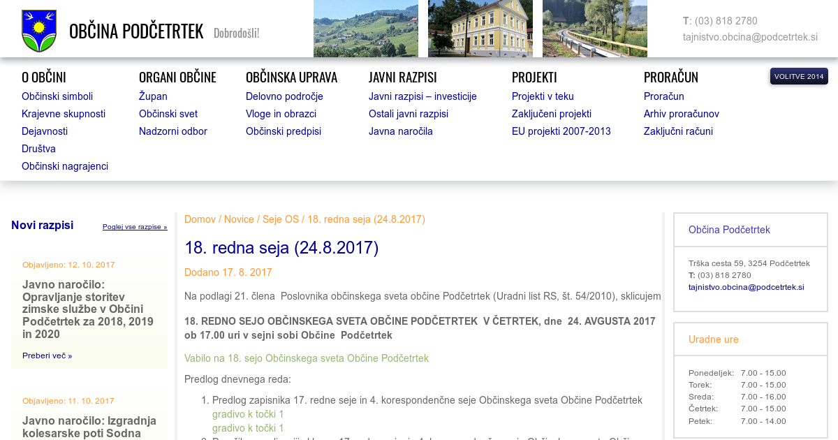 Na podlagi 21. člena Poslovnika občinskega sveta občine Podčetrtek (Uradni list RS, št. 54/2010), sklicujem 18. REDNO SEJO OBČINSKEGA SVETA OBČINE PODČETRTEK V ČETRTEK, dne 24. AVGUSTA 2017 ob 17.00 uri v sejni sobi Občine Podčetrtek Vabilo na 18. sejo Občinskega sveta Občine Podčetrtek Predlog dnevnega reda: Predlog zapisnika 17. redne seje in 4. korespondenčne