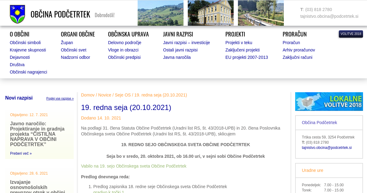 Na podlagi 31. člena Statuta Občine Podčetrtek (Uradni list RS, št. 43/2018-UPB) in 20. člena Poslovnika Občinskega sveta Občine Podčetrtek (Uradni list RS, št. 43/2018-UPB), sklicujem 19. REDNO SEJO OBČINSKEGA SVETA OBČINE PODČETRTEK Seja bo v sredo, 20. oktobra 2021, ob 16.00 uri, v sejni sobi Občine Podčetrtek Vabilo na 19. sejo Občinskega sveta Občine Podčetrtek
