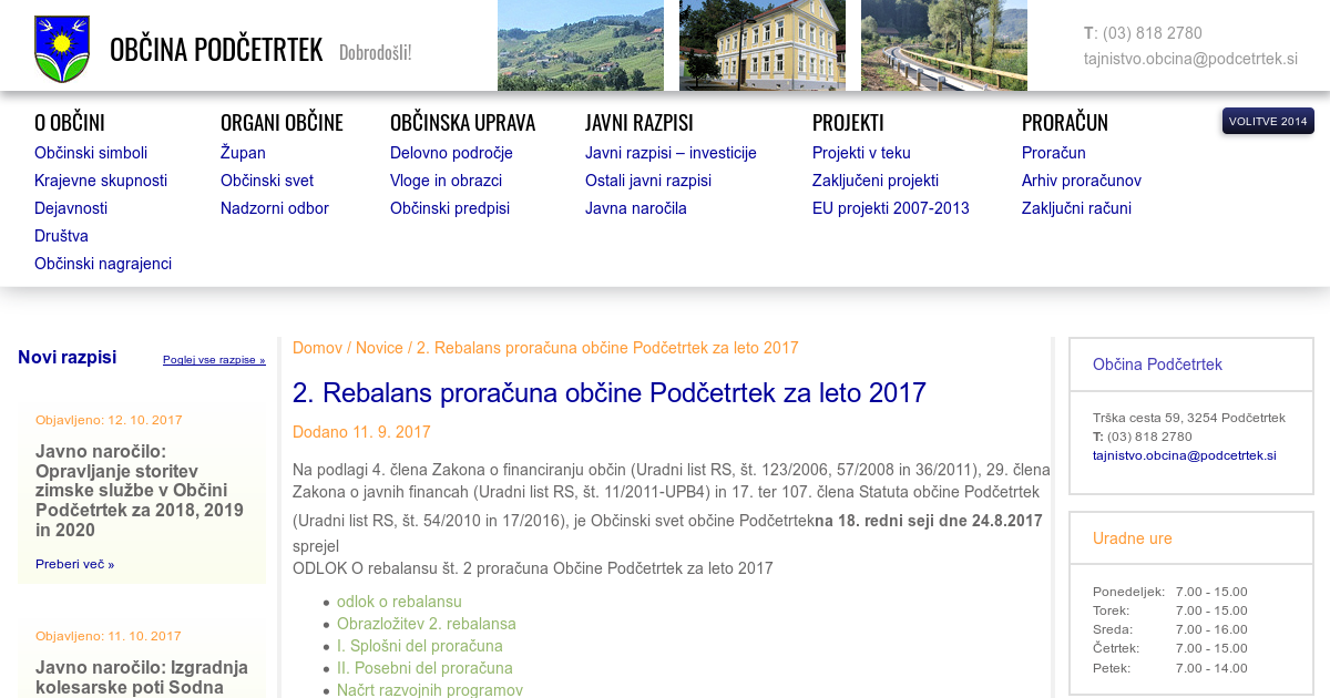 Na podlagi 4. člena Zakona o financiranju občin (Uradni list RS, št. 123/2006, 57/2008 in 36/2011), 29. člena Zakona o javnih financah (Uradni list RS, št. 11/2011-UPB4) in 17. ter 107. člena Statuta občine Podčetrtek (Uradni list RS, št. 54/2010 in 17/2016), je Občinski svet občine Podčetrtek na 18. redni seji dne 24.8.2017 sprejel ODLOK