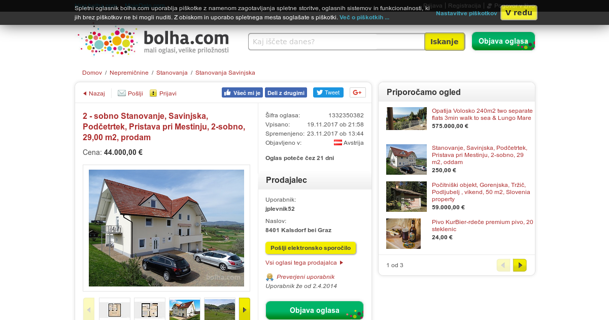 Kraj/naselje: Pristava pri Mestinju Tip: 2-sobno Velikost: 29, 00 m2 Velikost terase: 51, 00 Leto izgradnje:1986 Zadnja adaptacija:2012 Nadstropje: Pritličj