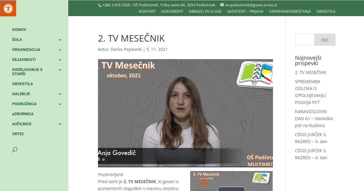 Pozdravljeni! Pred vami je 2. TV MESEČNIK, ki govori o pomembnih dogodkih v mesecu oktobru v šoli in kraju, ki predstavlja zvestega bralca Žigo in se poslavlja od dolgoletne tajnice Ivice… in še marsikaj zanimivega. Vabljeni k ogledu!