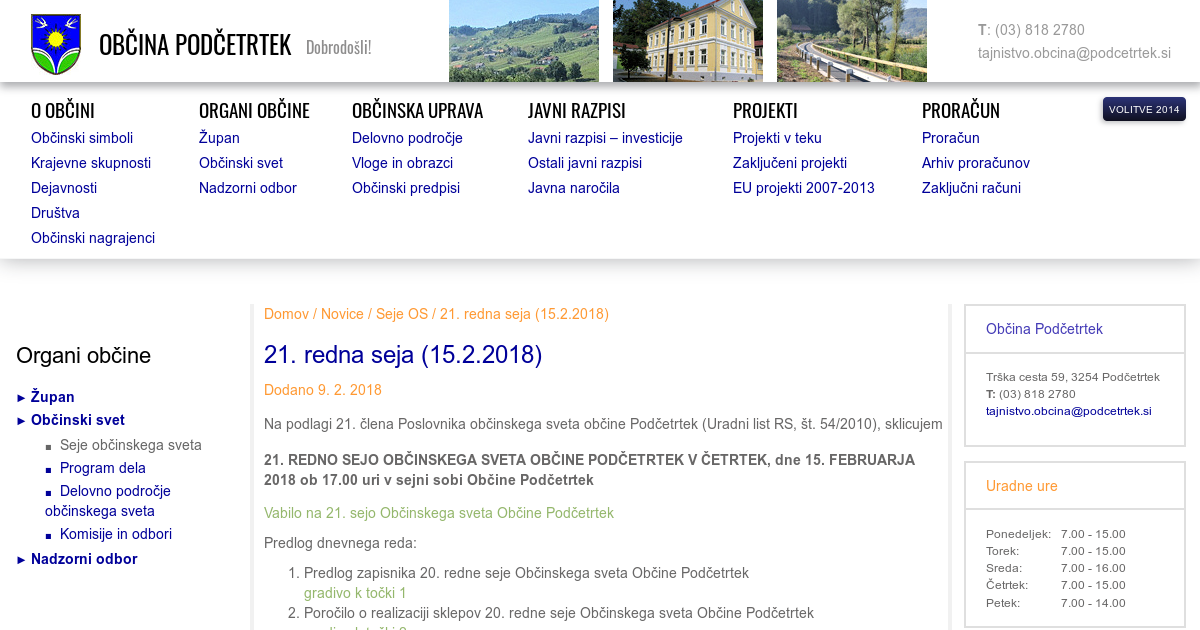 Na podlagi 21. člena Poslovnika občinskega sveta občine Podčetrtek (Uradni list RS, št. 54/2010), sklicujem 21. REDNO SEJO OBČINSKEGA SVETA OBČINE PODČETRTEK V ČETRTEK, dne 15. FEBRUARJA 2018 ob 17.00 uri v sejni sobi Občine Podčetrtek Vabilo na 21. sejo Občinskega sveta Občine Podčetrtek Predlog dnevnega reda: Predlog zapisnika 20. redne seje Občinskega sveta Občine