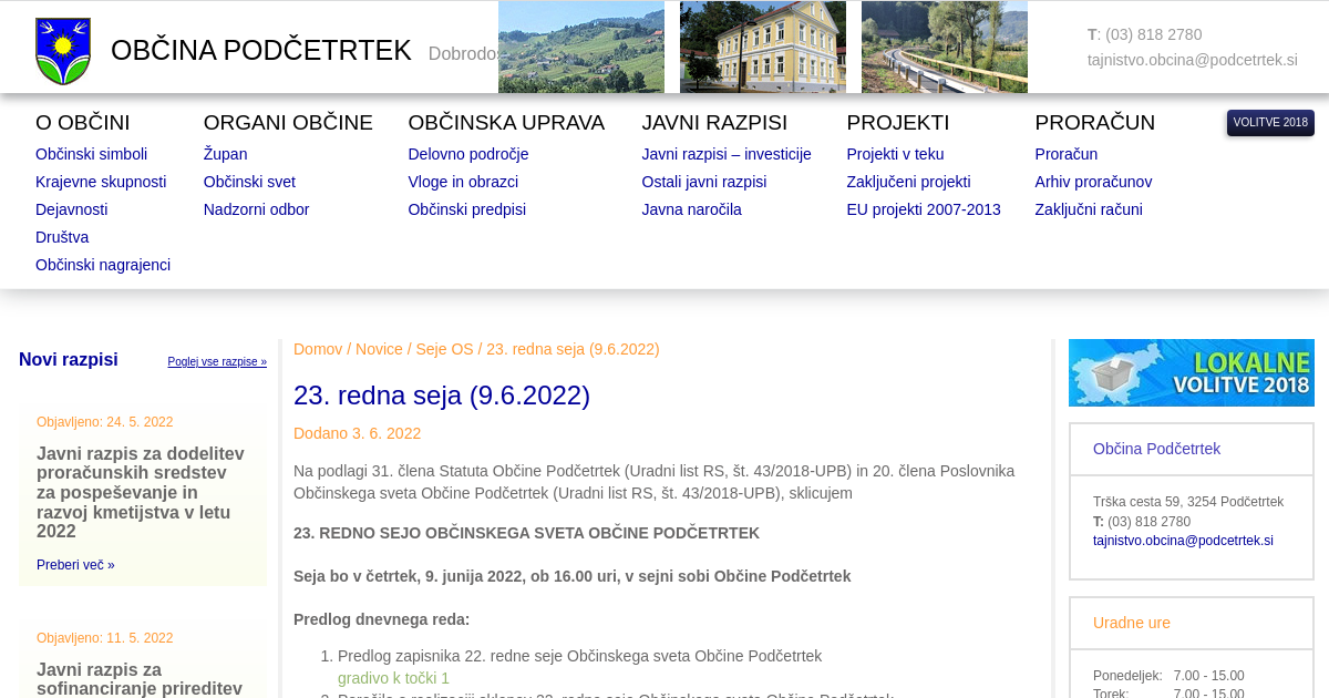 Na podlagi 31. člena Statuta Občine Podčetrtek (Uradni list RS, št. 43/2018-UPB) in 20. člena Poslovnika Občinskega sveta Občine Podčetrtek (Uradni list RS, št. 43/2018-UPB), sklicujem 23. REDNO SEJO OBČINSKEGA SVETA OBČINE PODČETRTEK Seja bo v četrtek, 9. junija 2022, ob 16.00 uri, v sejni sobi Občine Podčetrtek Predlog dnevnega reda: Predlog zapisnika 22. redne seje Občinskega