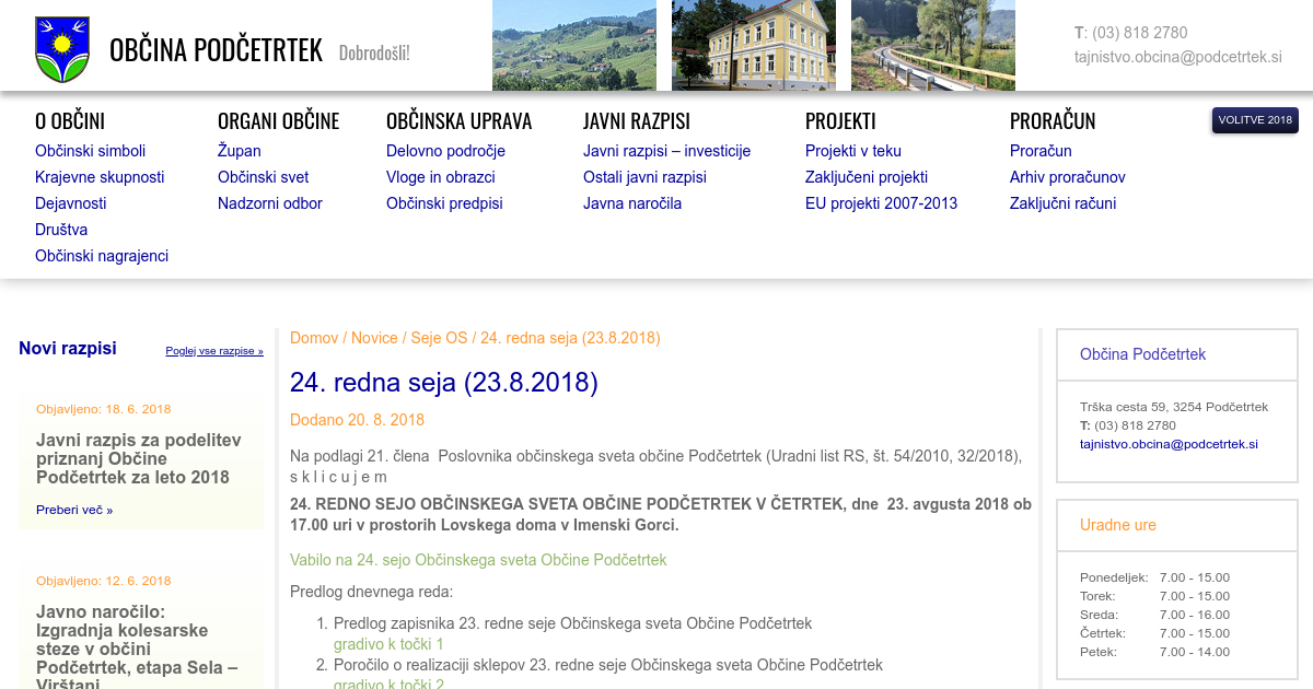 Na podlagi 21. člena Poslovnika občinskega sveta občine Podčetrtek (Uradni list RS, št. 54/2010, 32/2018), s k l i c u j e m 24. REDNO SEJO OBČINSKEGA SVETA OBČINE PODČETRTEK V ČETRTEK, dne 23. avgusta 2018 ob 17.00 uri v prostorih Lovskega doma v Imenski Gorci. Vabilo na 24. sejo Občinskega sveta Občine Podčetrtek