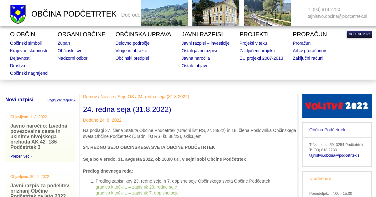 Na podlagi 27. člena Statuta Občine Podčetrtek (Uradni list RS, št. 88/22) in 18. člena Poslovnika Občinskega sveta Občine Podčetrtek (Uradni list RS, št. 88/22), sklicujem 24. REDNO SEJO OBČINSKEGA SVETA OBČINE PODČETRTEK Seja bo v sredo, 31. avgusta 2022, ob 16.00 uri, v sejni sobi Občine Podčetrtek Predlog dnevnega reda: Predlog zapisnikov 23. redne seje