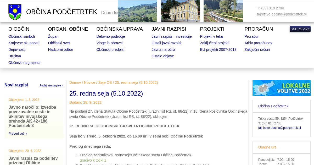 Na podlagi 27. člena Statuta Občine Podčetrtek (Uradni list RS, št. 88/22) in 18. člena Poslovnika Občinskega sveta Občine Podčetrtek (Uradni list RS, št. 88/22), sklicujem 25. REDNO SEJO OBČINSKEGA SVETA OBČINE PODČETRTEK Seja bo v sredo, 5. oktobra 2022, ob 16.00 uri, v sejni sobi Občine Podčetrtek Predlog dnevnega reda: Predlog zapisnika24. rednesejeObčinskega sveta Občine Podčetrtek