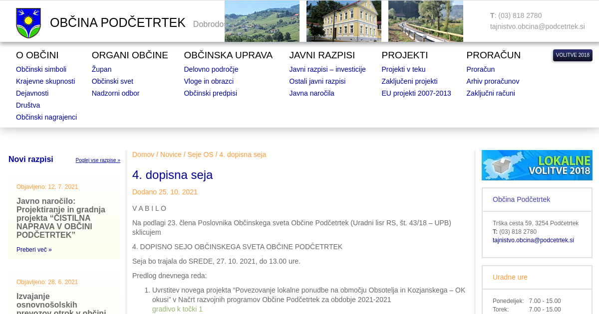 V A B I L O Na podlagi 23. člena Poslovnika Občinskega sveta Občine Podčetrtek (Uradni lisr RS, št. 43/18 – UPB) sklicujem 4. DOPISNO SEJO OBČINSKEGA SVETA OBČINE PODČETRTEK Seja bo trajala do SREDE, 27. 10. 2021, do 13.00 ure. Predlog dnevnega reda: Uvrstitev novega projekta “Povezovanje lokalne ponudbe na območju Obsotelja in Kozjanskega – OK