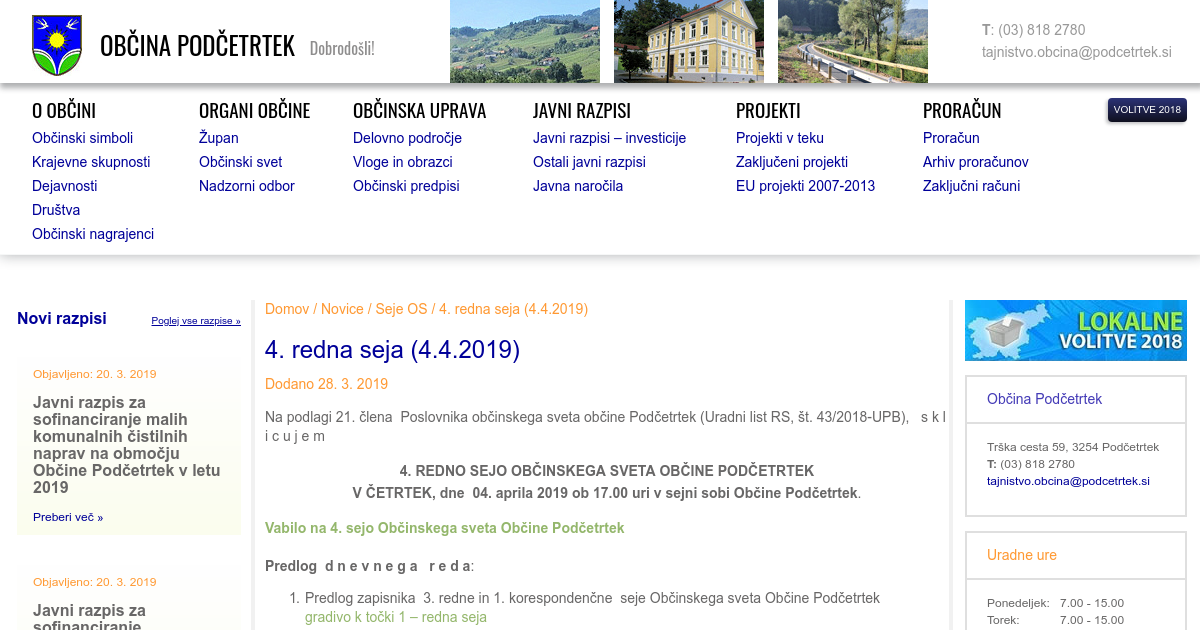 Na podlagi 21. člena Poslovnika občinskega sveta občine Podčetrtek (Uradni list RS, št. 43/2018-UPB), s k l i c u j e m 4. REDNO SEJO OBČINSKEGA SVETA OBČINE PODČETRTEK V ČETRTEK, dne 04. aprila 2019 ob 17.00 uri v sejni sobi Občine Podčetrtek. Vabilo na 4. sejo Občinskega sveta Občine Podčetrtek Predlog d n