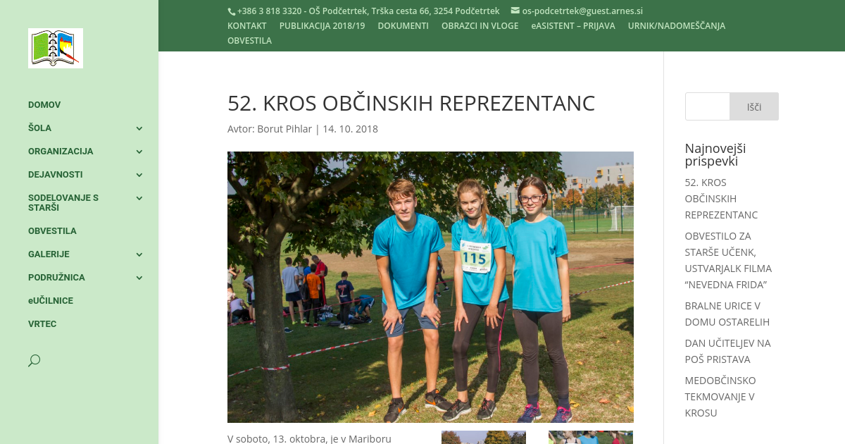 V soboto, 13. oktobra, je v Mariboru potekal že 52. kros občinskih reprezentanc. V združeno ekipo upravne enote Šmarje pri Jelšah, sta se uvrstili tudi dve naši učenki in en učenec. Karmen Umek je med devetošolkami osvojila 9. mesto, Gal Humski pri devetošolcih 11. mesto in Ema Osojnik med sedmošolkami 16. mesto.