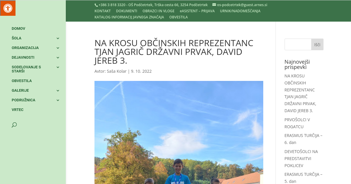 V soboto, 8. oktobra 2022, je na Ravnah na Koroškem potekal že 56. kros občinskih reprezentanc. V združeno ekipo upravne enote Šmarje pri Jelšah, se je uvrstilo tudi 6 učencev naše šole. Sara Benčina je med šestošolkami osvojila 10. mesto, Matevž Videtič pa pri šestošolcih 7. mesto. Tjan Jagrič pri sedmošolcih 1. mesto, Larisa Tornar Kokol 10. mesto ter David Jereb med osmošolci 3. mesto in Teja Amon med osmošolkami 13. mesto. Ekipno je upravna enota Šmarje pri Jelšah v Tjanovi konkurenci osvojila 1. mesto, v Davidovi pa 3. mesto.