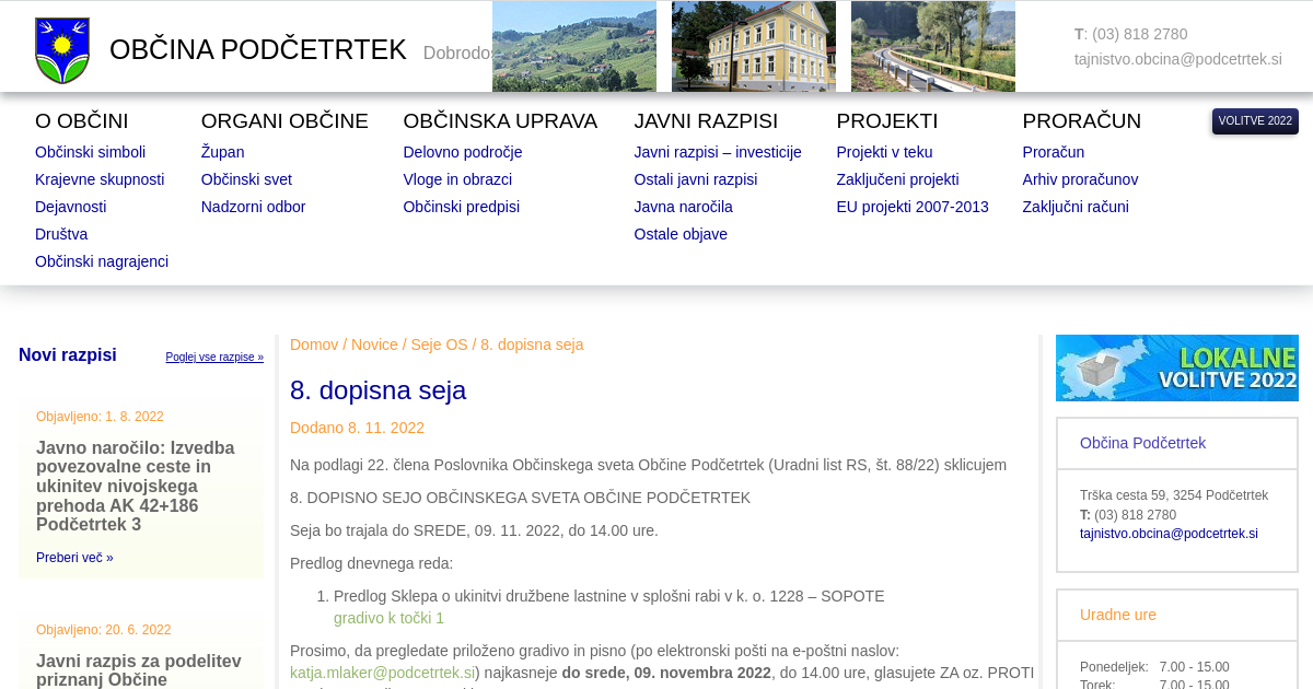 Na podlagi 22. člena Poslovnika Občinskega sveta Občine Podčetrtek (Uradni list RS, št. 88/22) sklicujem 8. DOPISNO SEJO OBČINSKEGA SVETA OBČINE PODČETRTEK Seja bo trajala do SREDE, 09. 11. 2022, do 14.00 ure. Predlog dnevnega reda: Predlog Sklepa o ukinitvi družbene lastnine v splošni rabi v k. o. 1228 – SOPOTE gradivo k točki 1 Prosimo,