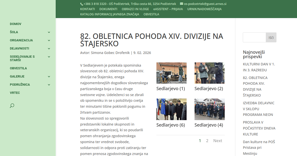 V Sedlarjevem je potekala spominska slovesnost ob 82. obletnici pohoda XIV. divizije na Štajersko, enega najpomembnejših dogodkov slovenskega partizanskega boja v času druge svetovne vojne. Udeleženci so se zbrali ob spomeniku in se s položitvijo cvetja ter minutami tišine poklonili pogumu in žrtvam partizanov. Na slovesnosti so spregovorili predstavniki lokalne skupnosti in veteranskih organizacij, ki so poudarili pomen ohranjanja zgodovinskega spomina ter vrednot svobode, solidarnosti in odpora proti zatiranju ter pomen prenosa zgodovinskega znanja na mlajše generacije. Dogodek je spremljal kulturni program, v katerem so sodelovali tudi učenci naše šole. Nastopili so Danaja Pušnik, Kevin Ropret in Filip Škorjanc, ki so s svojim nastopom pomembno prispevali k slovesnemu in spoštljivemu vzdušju dogodka.