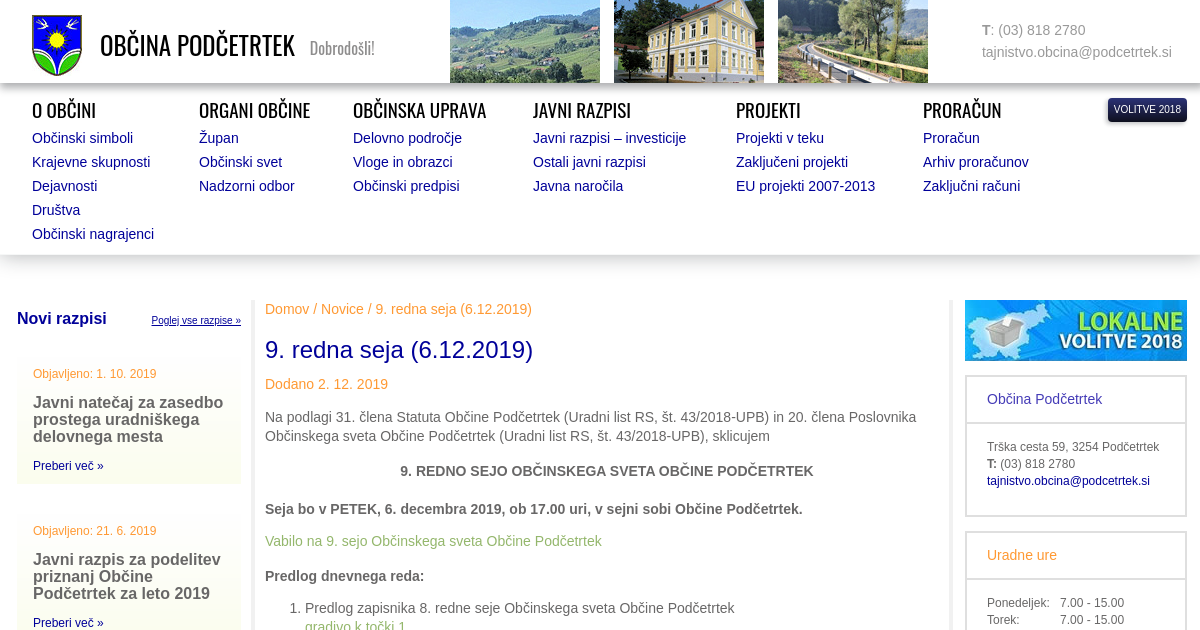 Na podlagi 31. člena Statuta Občine Podčetrtek (Uradni list RS, št. 43/2018-UPB) in 20. člena Poslovnika Občinskega sveta Občine Podčetrtek (Uradni list RS, št. 43/2018-UPB), sklicujem 9. REDNO SEJO OBČINSKEGA SVETA OBČINE PODČETRTEK Seja bo v PETEK, 6. decembra 2019, ob 17.00 uri, v sejni sobi Občine Podčetrtek. Vabilo na 9. sejo Občinskega sveta Občine Podčetrtek