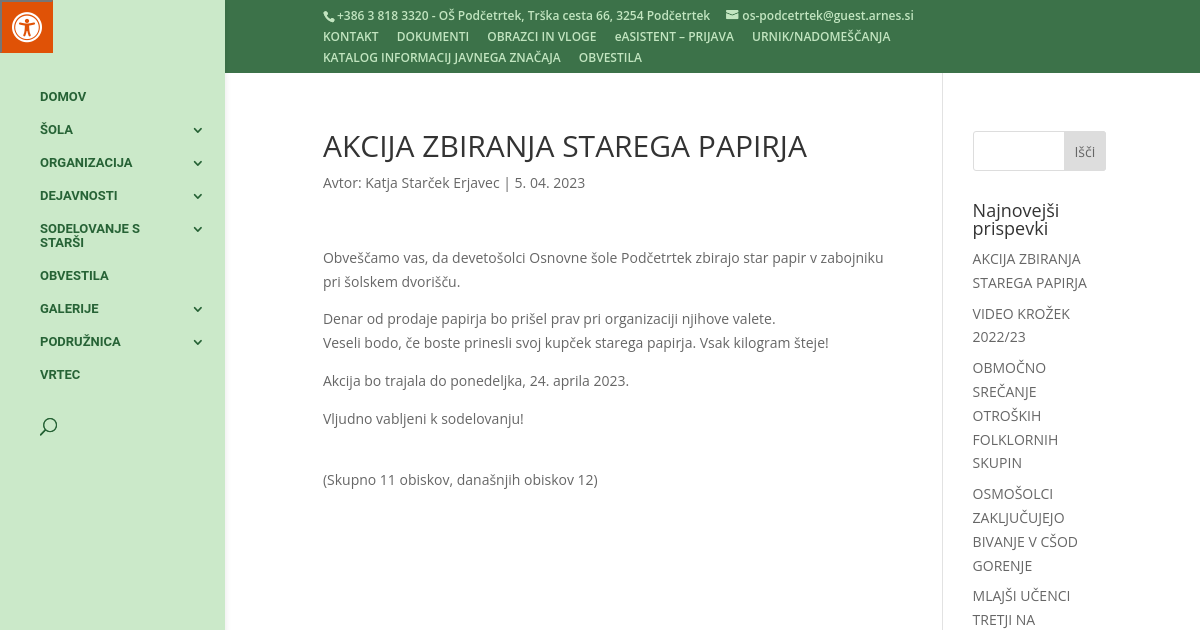 Obveščamo vas, da devetošolci Osnovne šole Podčetrtek zbirajo star papir v zabojniku pri šolskem dvorišču.