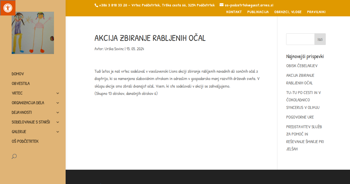 Tudi letos je naš vrtec sodeloval v vseslovenski Lions akciji zbiranje rabljenih navadnih ali sončnih očal z dioptrijo, ki so namenjena slabovidnim otrokom in odraslim v gospodarsko manj razvitih državah sveta. V sklopu akcije smo zbrali dvanajst očal. Vsem, ki ste sodelovali v akciji se zahvaljujemo.
