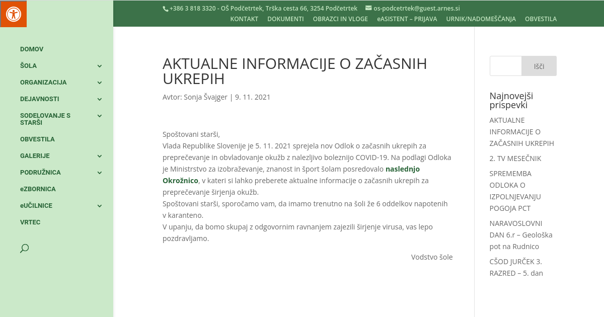 Spoštovani starši, Vlada Republike Slovenije je 5. 11. 2021 sprejela nov Odlok o začasnih ukrepih za preprečevanje in obvladovanje okužb z nalezljivo boleznijo COVID-19. Na podlagi Odloka je Ministrstvo za izobraževanje, znanost in šport šolam posredovalo naslednjo Okrožnico, v kateri si lahko preberete aktualne informacije o začasnih ukrepih za preprečevanje širjenja okužb. Spoštovani starši, sporočamo vam, da imamo trenutno na šoli že 6 oddelkov napotenih v karanteno. V upanju, da bomo skupaj z odgovornim ravnanjem zajezili širjenje virusa, vas lepo pozdravljamo.