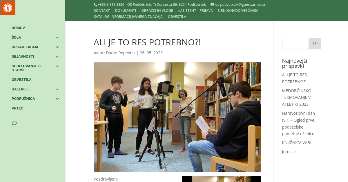 Pozdravljeni! Devetošolci Jacqueline Debelak, Sara Dvoršak, Žan Golej in Filip Guzej so ustvarili filmček na temo Dobro počutje in internet. Dali so mu naslov “Ali je to res potrebno?!” in ga poslali na republiški video natečaj SAFE.SI in osvojili 5. mesto. Filmček govori o velikih škodljivostih pretirane in nenadzorovane rabe pametnega telefona, zato se vedno, ko vzamete telefon v roke, vprašajte, ali je to res potrebno?! Poklon in čestitke mladim filmskim ustvarjalcem. Na desni si lahko pogledate njihov filmček, TUKAJ pa najdete video izdelke letošnjih zmagovalcev.