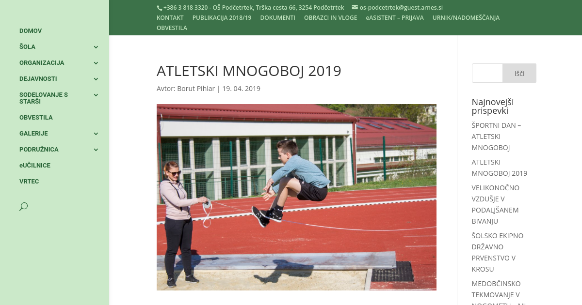 V petek 19. aprila smo izvedli šolsko tekmovanje v atletskem mnogoboju. Učenci in učenke 6. in 7. razreda so se pomerili v petih atletskih panogah Učenci in učenke 7. in 8. razreda pa še dodatno v suvanju krogle. REZULTATI ATLETSKEGA MNOGOBOJA 2019