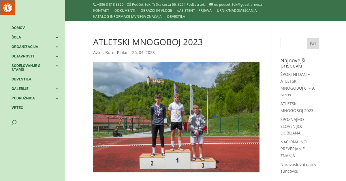 V SREDO 26. aprila smo izvedli šolsko tekmovanje v atletskem mnogoboju. Učenci in učenke 6. in 7. razreda so se pomerili v petih atletskih panogah Učenci in učenke 7. in 8. razreda pa še dodatno v suvanju krogle. David Jereb je postavil tudi nov šolski rekord, zbral je odličnih 6054 točk. REZULTATI ATLETSKEGA MNOGOBOJA 2023
