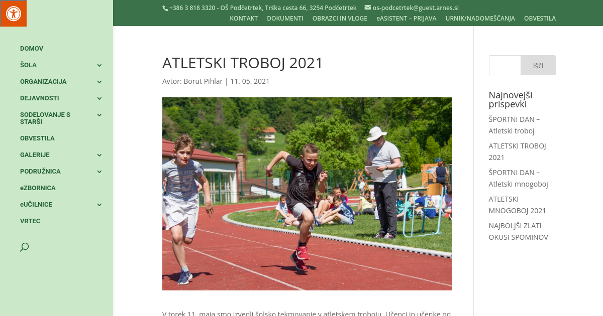 V torek 11. maja smo izvedli šolsko tekmovanje v atletskem troboju. Učenci in učenke od 1. do 5. razreda matične in podružnične šole so se pomerili v treh atletskih disciplinah, teku na 60 m, skoku v daljino in metu vortexa.. REZULTATI ATLETSKEGA TROBOJA 2021