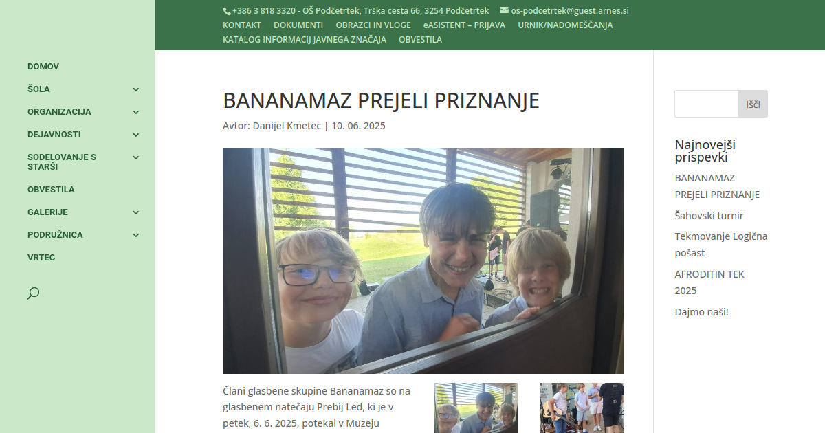 Člani glasbene skupine Bananamaz so na glasbenem natečaju Prebij Led, ki je v petek, 6. 6. 2025, potekal v Muzeju baroka v Šmarju pri Jelšah, prejeli priznanje in si tako zagotovili nastop na prireditvi Kulturnega doma Šmarje pri Jelšah, ki bo 5. julija v prostorih Kulturnice v Kulturnem domu Šmarje pri Jelšah. Čestitke fantom 7. a in b razreda – Filipu Toplišku, Mihi Plesničarju in Marku Debelaku.