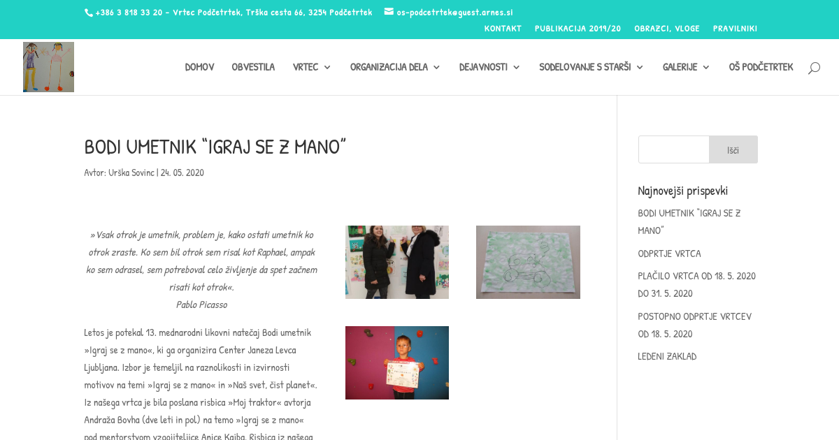 Letos je potekal 13. mednarodni likovni natečaj Bodi umetnik »Igraj se z mano«, ki ga organizira Center Janeza Levca Ljubljana. Izbor je temeljil na raznolikosti in izvirnosti motivov na temi »Igraj se z mano« in »Naš svet, čist planet«. Iz našega vrtca je bila poslana risbica »Moj traktor« avtorja Andraža Bovha (dve leti in pol) na temo »Igraj se z mano« pod mentorstvom vzgojiteljice Anice Kajba. Risbica iz našega vrtca je prišla v izbor in je bila na razstavi v Koroški galeriji likovnih umetnosti v Slovenj Gradcu. Avtorji in mentorji izbranih likovnih del smo bili vabljeni na 13. Mednarodno potujočo likovno razstavo. Razstava je potekala 4. marca 2020, kot kulturno likovna prireditev s podelitvijo priznanj v dopoldanskem času. Mednarodno priznanje je bilo poslano po pošti avtorju in mentorici za kar sva zelo vesela in hvaležna. Prireditve se nismo udeležili, smo pa našli čas za ogled razstave v popoldanskem času. Pri ogledu različnih risbic je bilo zaznati, kako otroci z likovnimi sredstvi, tehnikami, materiali in orodji, še bolj pa z aktivno uporabo likovnih izrazil (črte, barve, prostornine…), ostrijo svoje čute in domišljijsko ustvarjalnost.