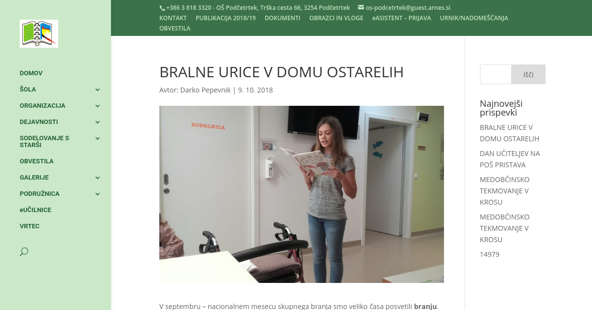 V septembru – nacionalnem mesecu skupnega branja smo veliko časa posvetili branju. Brali smo skupaj, brali smo sami, delili svoje izkušnje med seboj, razveseljevali z branjem tudi druge, ki še ne znajo brati ali pa iz kakršnihkoli razlogov ne morejo. Brali pa smo tudi zato, da smo jim preprosto krajšali čas in jih skozi zgodbe popeljali v čas otroštva in med dogodke našega časa. Za varovance Doma ostarelih v Podčetrtku smo namreč organizirali medgeneracijsko branje. Bralne urice so potekale vsako sredo, izvajale pa so jih naše učenke, ki so takole strnile doživete vtise:
