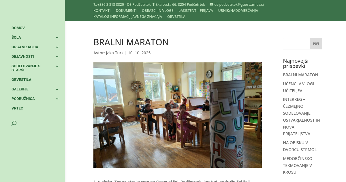 V okviru Tedna otroka smo na Osnovni šoli Podčetrtek kot tudi podružnični šoli Pristava izvedli bralni maraton. Učenci od 1. do 5. razreda so ob obisku bralne štafete z veseljem brali svoje knjige in tako pokazali, da radi posegajo po branju.