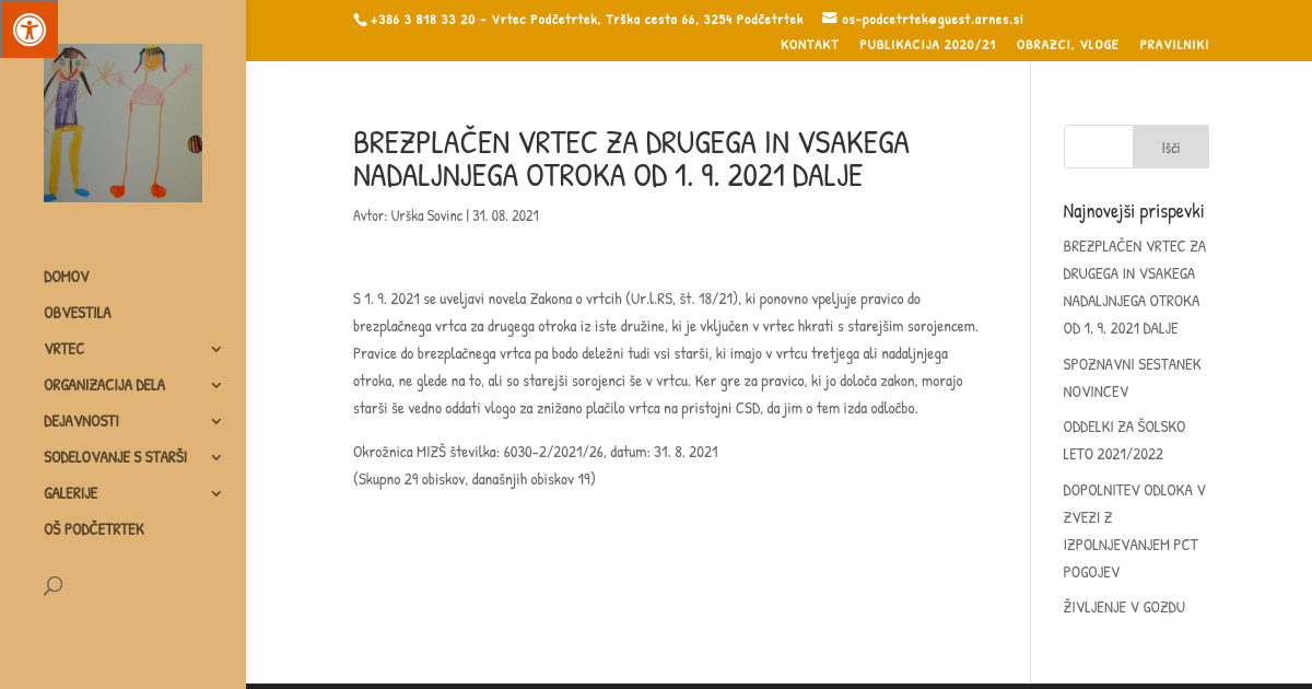 S 1. 9. 2021 se uveljavi novela Zakona o vrtcih (Ur.l.RS, št. 18/21), ki ponovno vpeljuje pravico do brezplačnega vrtca za drugega otroka iz iste družine, ki je vključen v vrtec hkrati s starejšim sorojencem. Pravice do brezplačnega vrtca pa bodo deležni tudi vsi starši, ki imajo v vrtcu tretjega ali nadaljnjega otroka, ne glede na to, ali so starejši sorojenci še v vrtcu. Ker gre za pravico, ki jo določa zakon, morajo starši še vedno oddati vlogo za znižano plačilo vrtca na pristojni CSD, da jim o tem izda odločbo.