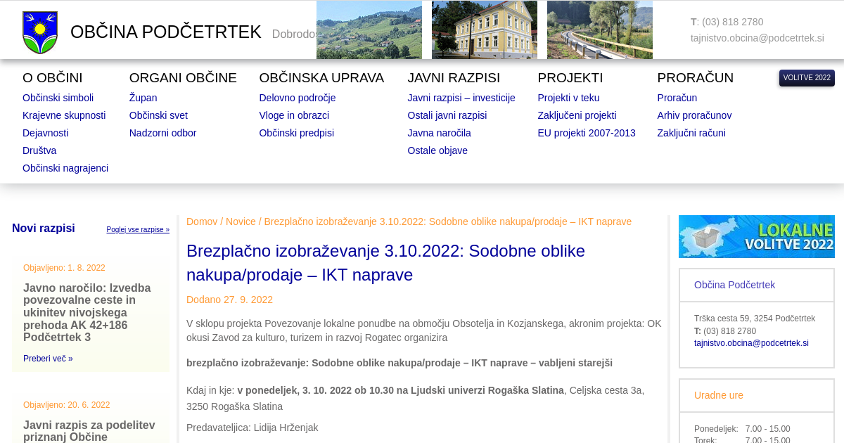 V sklopu projekta Povezovanje lokalne ponudbe na območju Obsotelja in Kozjanskega, akronim projekta: OK okusi Zavod za kulturo, turizem in razvoj Rogatec organizira brezplačno izobraževanje: Sodobne oblike nakupa/prodaje – IKT naprave – vabljeni starejši Kdaj in kje: v ponedeljek, 3. 10. 2022 ob 10.30 na Ljudski univerzi Rogaška Slatina, Celjska cesta 3a, 3250 Rogaška Slatina Predavateljica:
