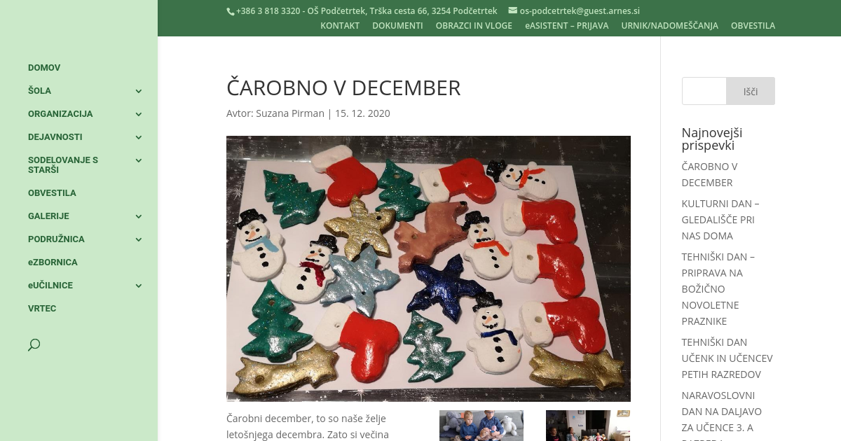 Čarobni december, to so naše želje letošnjega decembra. Zato si večina petkov pričaramo v posebnem, ustvarjalnem, čarobnem vzdušju. Gledališče smo si privoščili kar iz dnevne sobe, izdelovali smo novoletne okraske za čarobno okrasitev domov, pekli piškote in druge dobrote ter poskrbeli tudi za to, da izrečemo nekaj lepega, čarobnega, nekomu, ki nam je blizu… Seveda pa nismo pozabili na čarobno vzdušje na snegu… In še nas čaka, kaj čarobnega.
