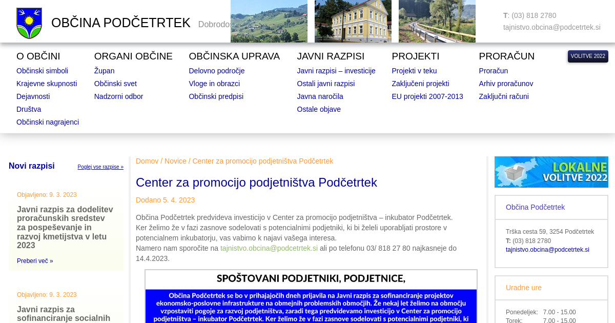 Občina Podčetrtek predvideva investicijo v Center za promocijo podjetništva – inkubator Podčetrtek. Ker želimo že v fazi zasnove sodelovati s potencialnimi podjetniki, ki bi želeli uporabljati prostore v potencialnem inkubatorju, vas vabimo k najavi vašega interesa. Namero nam sporočite na tajnistvo.obcina@podcetrtek.si ali po telefonu 03/ 818 27 80 najkasneje do 14.4.2023.
