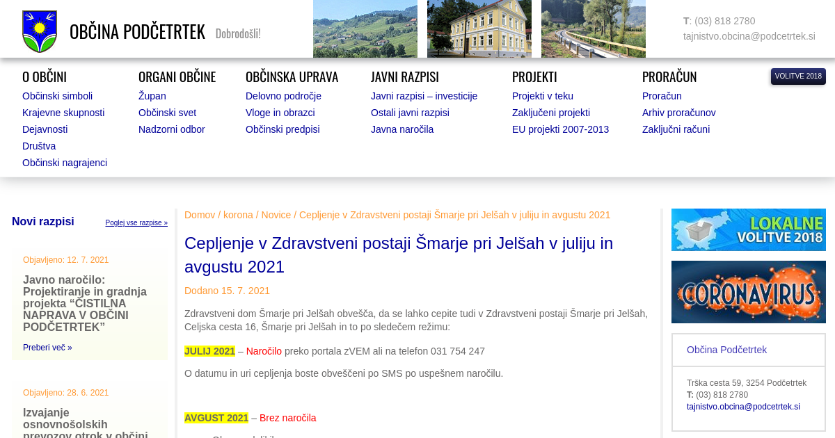 Zdravstveni dom Šmarje pri Jelšah obvešča, da se lahko cepite tudi v Zdravstveni postaji Šmarje pri Jelšah, Celjska cesta 16, Šmarje pri Jelšah in to po sledečem režimu: JULIJ 2021 – Naročilo preko portala zVEM ali na telefon 031 754 247 O datumu in uri cepljenja boste obveščeni po SMS po uspešnem naročilu. AVGUST 2021 – Brez naročila Ob