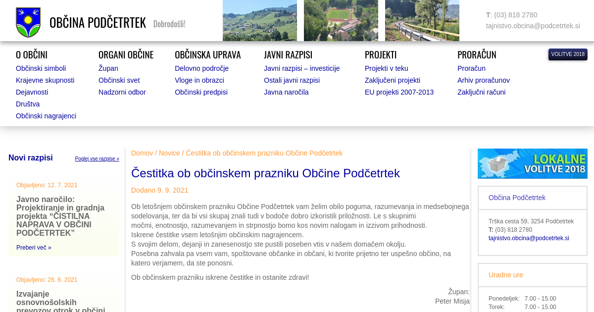 Ob letošnjem občinskem prazniku Občine Podčetrtek vam želim obilo poguma, razumevanja in medsebojnega sodelovanja, ter da bi vsi skupaj znali tudi v bodoče dobro izkoristili priložnosti. Le s skupnimi močmi, enotnostjo, razumevanjem in strpnostjo bomo kos novim nalogam in izzivom prihodnosti. Iskrene čestitke vsem letošnjim občinskim nagrajencem. S svojim delom, dejanji in zanesenostjo ste pustili poseben vtis v našem domačem