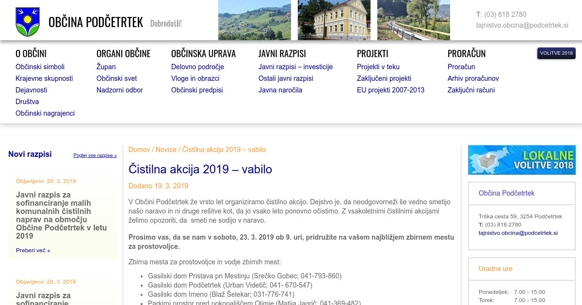 V Občini Podčetrtek že vrsto let organiziramo čistilno akcijo. Dejstvo je, da neodgovorneži še vedno smetijo našo naravo in ni druge rešitve kot, da jo vsako leto ponovno očistimo. Z vsakoletnimi čistilnimi akcijami želimo opozoriti, da smeti ne sodijo v naravo. Prosimo vas, da se nam v soboto, 23. 3. 2019 ob 9. uri, pridružite