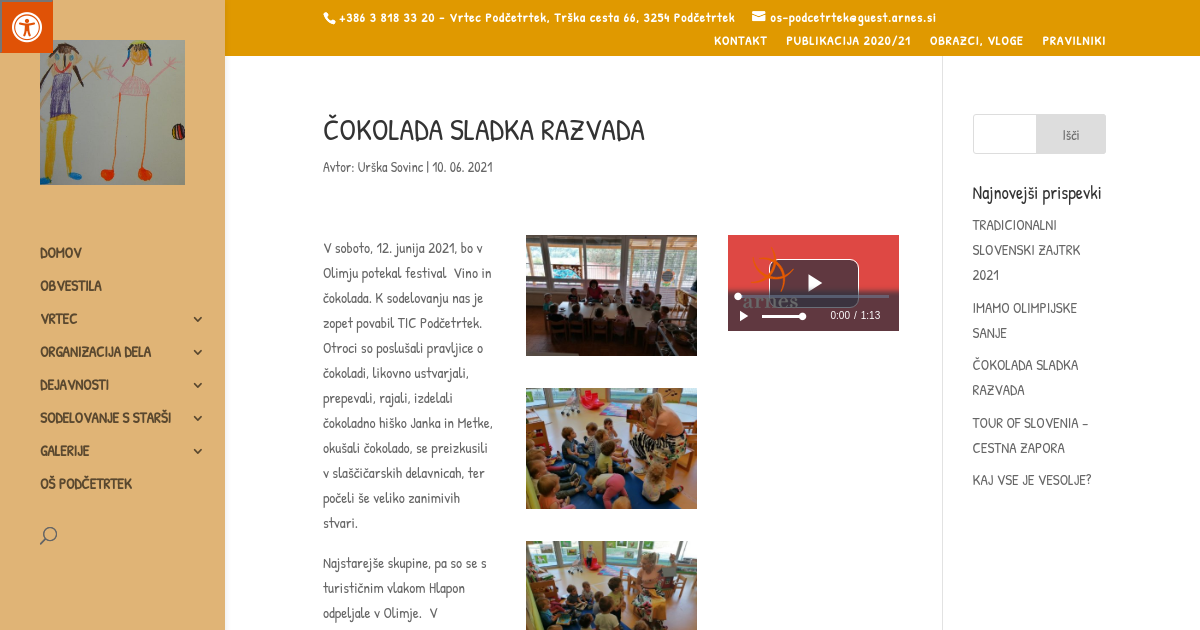 V soboto, 12. junija 2021, bo v Olimju potekal festival Vino in čokolada. K sodelovanju nas je zopet povabil TIC Podčetrtek. Otroci so poslušali pravljice o čokoladi, likovno ustvarjali, prepevali, rajali, izdelali čokoladno hiško Janka in Metke, okušali čokolado, se preizkusili v slaščičarskih delavnicah, ter počeli še veliko zanimivih stvari.