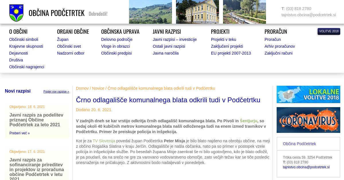 V zadnjih dneh se kar vrstijo odkritja črnih odlagališč komunalnega blata. Po Pivoli in Šentjurju, so sedaj okoli 40 kubičnih metrov komunalnega blata našli odloženega tudi na enem izmed travnikov v Podčetrtku. Primer že preiskuje policija in inšpekcija. Kot je za TV Slovenija povedal župan Podčetrtka Peter Misja je bilo blato najdeno na obrobju občine, na meji z občino Rogaška