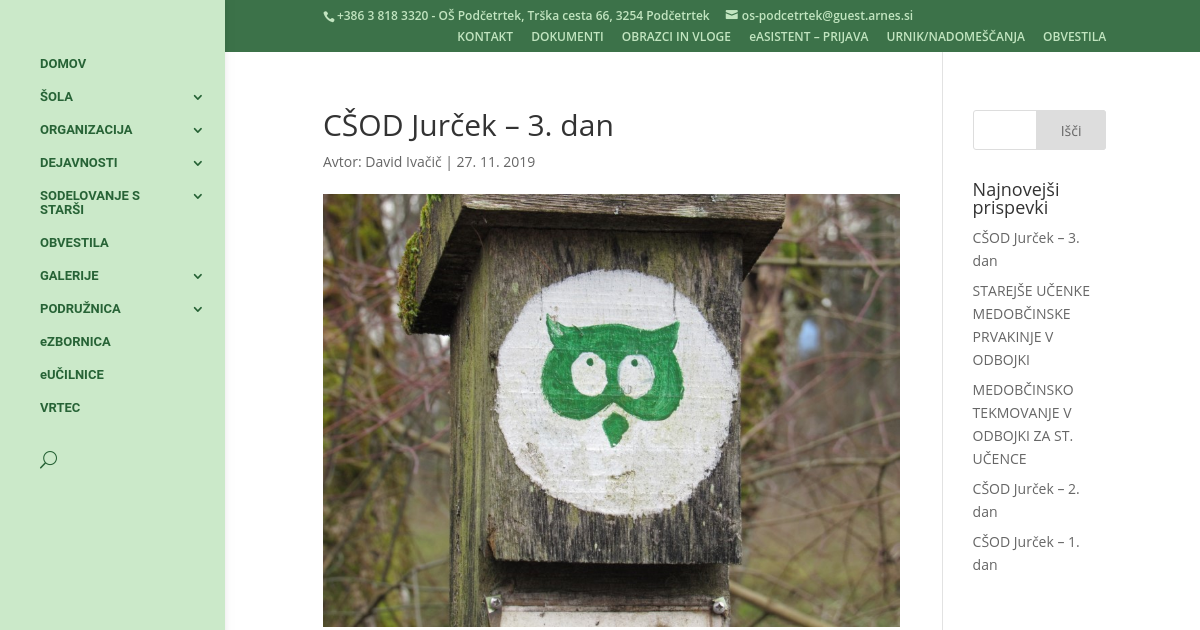 Tretji dan smo nadaljevali z raziskovanjem jam, pohodniških in gozdnih učnih poti. Prijazni učitelji CŠOD Jurček nam vsak dan postrežejo s kakšno zanimivostjo, zgodbo, lokalno legendo. Ko smo že ravno pri postrežbi, bi radi pohvalili tudi tukajšnje kuharice, ki nam pripravljajo resnično odlično hrano. Čez dan sta nas obiskala tudi učitelja iz Španije, ki se v sklopu projekta Erasmus+ KA1 mudita na OŠ Podčetrtek. V spremstvu naše podravnateljice in svetovalne delavke sta si ogledala CŠOD Jurček, spoznala način dela ter poklepetala z učitelji in učenci. Po kosilu je sledilo delo po skupinah. Izdelovali smo vetrnice, igrali namizni tenis in se preizkusili v lokostrelstvu. V večernih urah pa nas čaka še zabavni kviz.