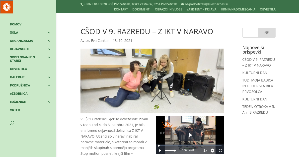V CŠOD Radenci, kjer so devetošolci bivali v tednu od 4. do 8. oktobra 2021, je bila ena izmed dejavnosti delavnica Z IKT V NARAVO. Učenci so v naravi nabirali naravne materiale, s katerimi so morali v manjših skupinah s pomočjo programa Stop motion posneti krajši film – animacijo. Predstavljamo vam njihove izdelke/filme.