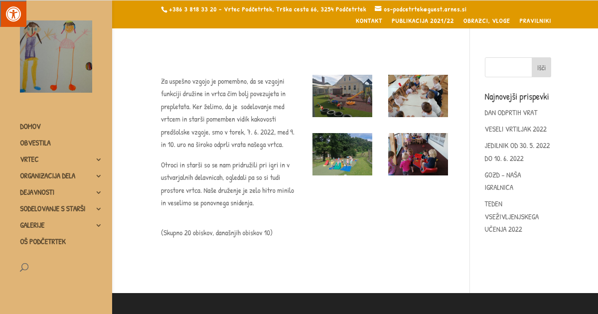 Za uspešno vzgojo je pomembno, da se vzgojni funkciji družine in vrtca čim bolj povezujeta in prepletata. Ker želimo, da je sodelovanje med vrtcem in starši pomemben vidik kakovosti predšolske vzgoje, smo v torek, 7. 6. 2022, med 9. in 10. uro na široko odprli vrata našega vrtca.