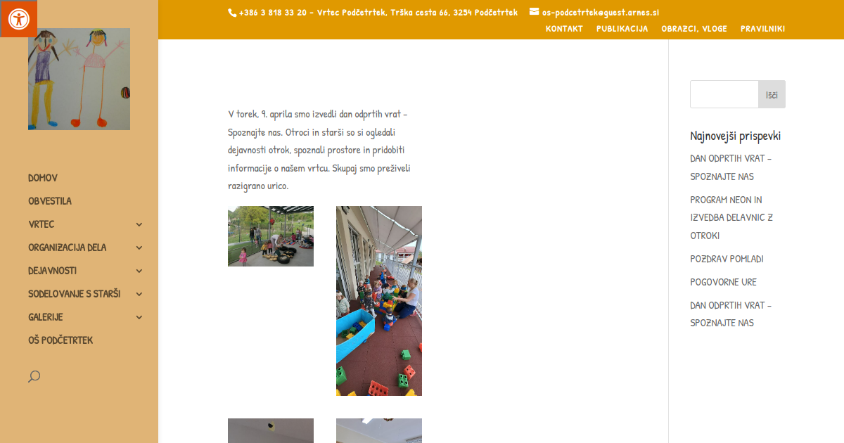 V torek, 9. aprila smo izvedli dan odprtih vrat – Spoznajte nas. Otroci in starši so si ogledali dejavnosti otrok, spoznali prostore in pridobiti informacije o našem vrtcu. Skupaj smo preživeli razigrano urico.