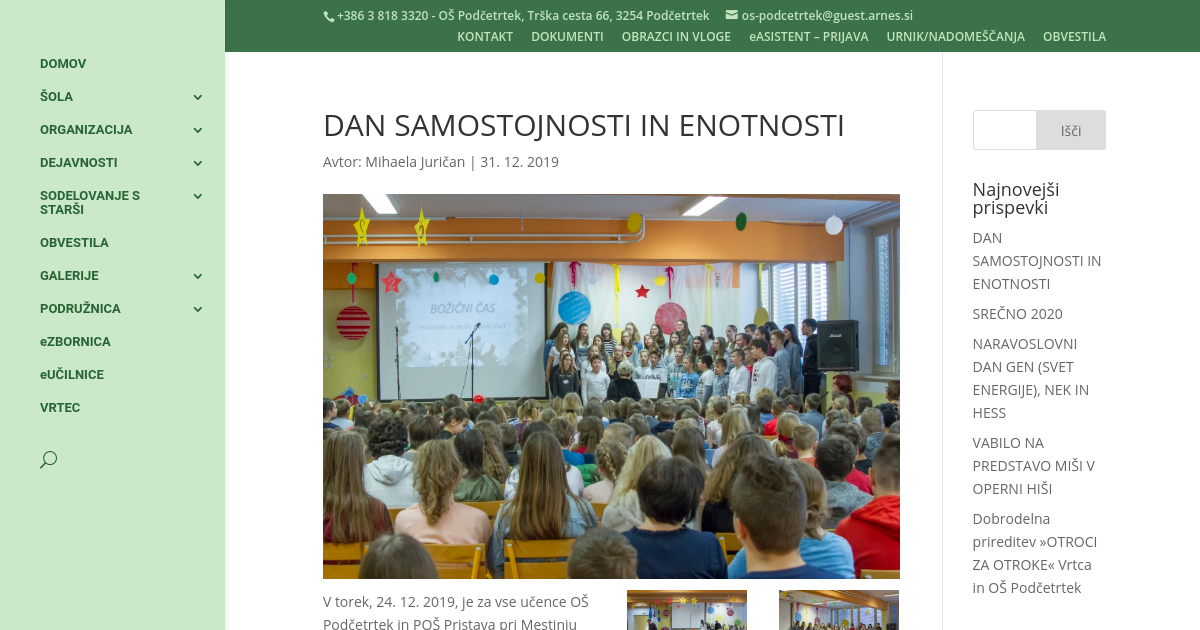 V torek, 24. 12. 2019, je za vse učence OŠ Podčetrtek in POŠ Pristava pri Mestinju potekala proslava v počastitev dneva samostojnosti in enotnosti. V kulturnem programu smo se na kratko sprehodili čez zgodovino razvoja slovenske narodne zavesti in kulturnega ustvarjanja, kar sovpada z obeležitvijo letošnjega Vodnikovega leta. Ponovno smo posebno pozornost namenili pomenu enotnosti in razmišljanju o naši domovini, njenih lepotah in pomenu slovenske besede. Z recitacijami, pesmimi in plesom so se predstavili učenci podružnične in matične osnovne šole. Praznično obarvana govora gospe ravnateljice in gospoda župana sta odprla vrata veselemu vzdušju, ki je sledilo ob druženju po razredih. Učenci višje stopnje pa so si v Šmarju pri Jelšah nato ogledali še kino predstavo Košarkar naj bo 2.